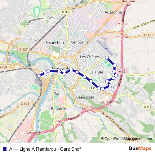 The first stop of the A bus route is Gare Sncf and the last stop is Ramierou. A (Ligne A Ramierou - Gare Sncf) is operational during todos los días.