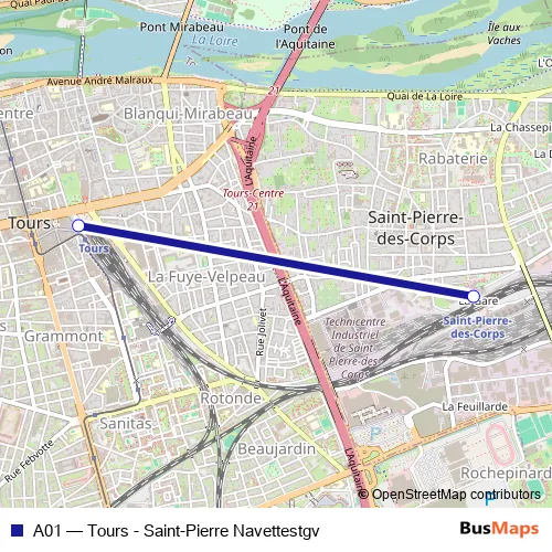 The first stop of the A01 rail route is Saint-Pierre-des-Corps and the last stop is Tours. A01 (Tours - Saint-Pierre Navettestgv) is operational during todos los días.
