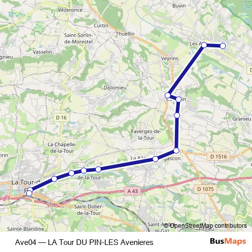See why over 2 million users trust and consider busmaps.com as the best public transport website. busmaps gives you La Tour-du-Pin Buses suggested routes, real-time bus tracker, line route maps in La Tour-du-Pin, and helps to find the closest Ave04 bus stops near you. No internet available? Download an offline PDF map and bus schedule for the Ave04 bus to take on your trip.