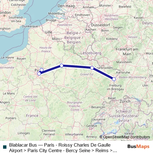 The first stop of the Blablacar Bus bus route is Paris - Roissy Charles De Gaulle Airport and the last stop is Strasbourg. Blablacar Bus (Paris - Roissy Charles De Gaulle Airport > Paris City Centre - Bercy Seine > Reims > Strasbourg) is operational during todos los días.