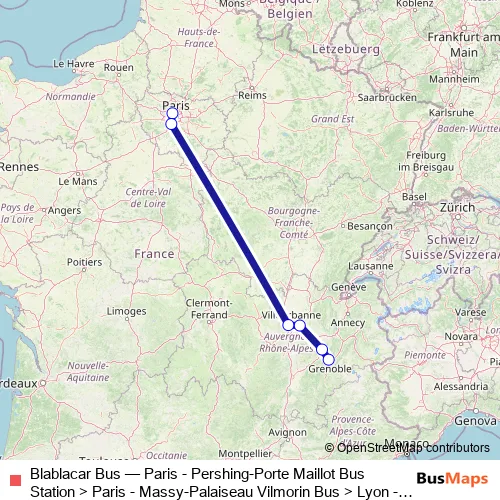 The first stop of the Blablacar Bus bus route is Grenoble - Bus Station and the last stop is Paris - Pershing-Porte Maillot Bus Station. Blablacar Bus (Paris - Pershing-Porte Maillot Bus Station > Paris - Massy-Palaiseau Vilmorin Bus > Lyon - Gerland Bus Station > Lyon - St. Exupéry Airport T1 Bus Stop > Voiron - Champfeuillet > Grenoble - Bus Station) is operational during los fines de semana.
