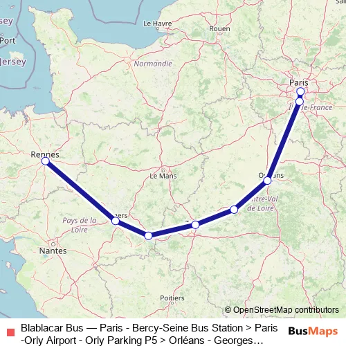 Bus Blablacar Bus - Paris - Bercy-Seine Bus Station > Paris-Orly Airport - Orly Parking P5 > Orléans - Georges Pompidou Bus Stop > Blois > Tours - Édouard Vaillant Bus Station > Saumur North > Angers - Bus Station Esplanade > Rennes - Bus Station: Full Schedule in Paris