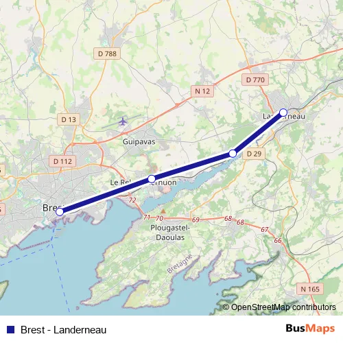 See why over 2 million users trust and consider busmaps.com as the best public transport website. busmaps gives you Brest Rail Services suggested routes, real-time bus tracker, line route maps in Brest, and helps to find the closest Brest - Landerneau rail stops near you. No internet available? Download an offline PDF map and bus schedule for the Brest - Landerneau rail to take on your trip.