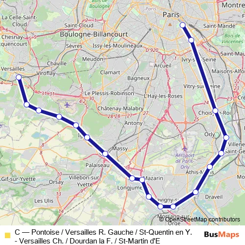 The first stop of the C bus route is Massy Palaiseau and the last stop is Gare D'Austerlitz. C (Pontoise / Versailles R. Gauche / St-Quentin en Y. - Versailles Ch. / Dourdan la F. / St-Martin d'E) is operational during todos los días.