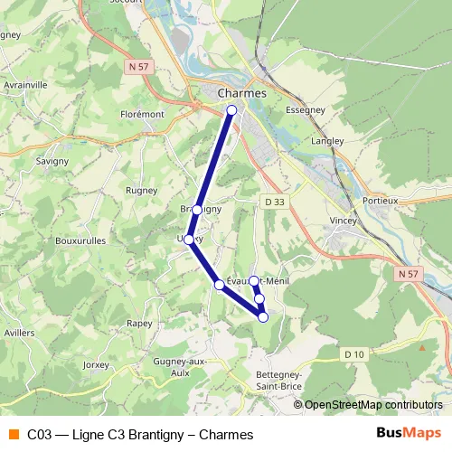 The first stop of the C03 bus route is Charmes College and the last stop is Evaux ET Menil Evaux Mairie. C03 (Ligne C3 Brantigny – Charmes) is operational during entre semana.
