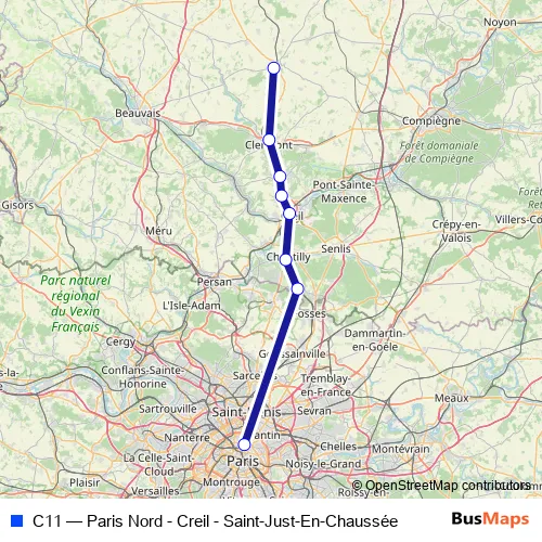 The first stop of the C11 rail route is Saint-Just-en-Chaussée and the last stop is Paris Gare du Nord. C11 (Paris Nord - Creil - Saint-Just-En-Chaussée) is operational during todos los días.