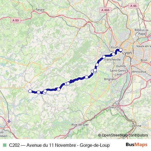 The first stop of the C202 trolleybus route is Chazelles - Av. Du 11 Nov and the last stop is Gorge de Loup. C202 (Avenue du 11 Novembre - Gorge-de-Loup) is operational during todos los días.
