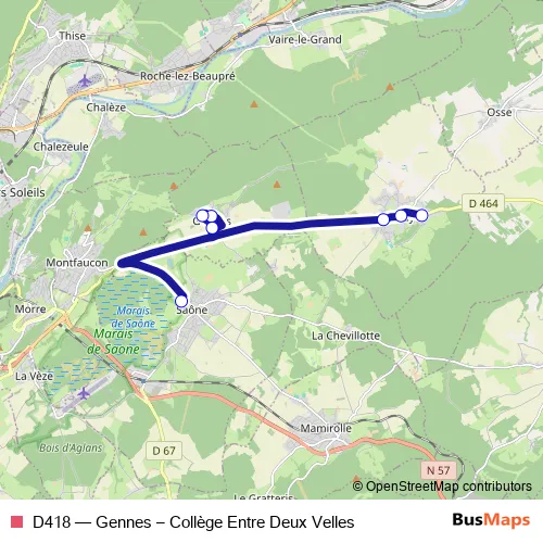 The first stop of the D418 bus route is Saône - Collège de Saône and the last stop is Nancray - Les Pins. D418 (Gennes – Collège Entre Deux Velles) is operational during entre semana.