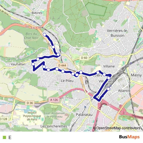 The first stop of the E bus route is Gare de Massy - Palaiseau and the last stop is Docteur Schweitzer. E is operational during todos los días.