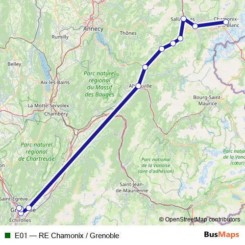 The first stop of the E01 bus route is Saint-Gervais-les-Bains-Le Fayet and the last stop is Grenoble. E01 (RE Chamonix / Grenoble) is operational during todos los días.
