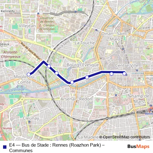 See why over 2 million users trust and consider busmaps.com as the best public transport website. busmaps gives you Rennes Buses suggested routes, real-time bus tracker, line route maps in Rennes, and helps to find the closest E4 bus stops near you. No internet available? Download an offline PDF map and bus schedule for the E4 bus to take on your trip.