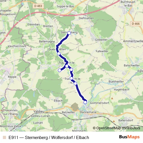 The first stop of the E911 bus route is Sternenberg - Mairie Ecole and the last stop is Wolfersdorf - Ecole. E911 (Sternenberg / Wolfersdorf / Elbach) is operational during todos los días.