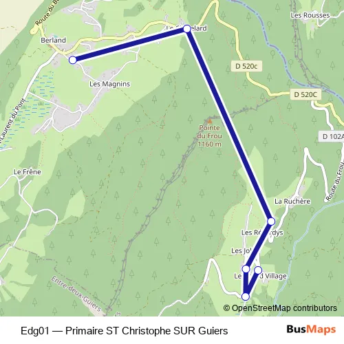 The first stop of the Edg01 bus route is Ecole du Frou and the last stop is Le Grand Village. Edg01 (Primaire ST Christophe SUR Guiers) is operational during todos los días.