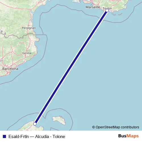 The first stop of the Esald-Frtln ferry route is Porto di Alcudia and the last stop is Porto di Tolone. Esald-Frtln (Alcudia - Tolone) is operational during los fines de semana.