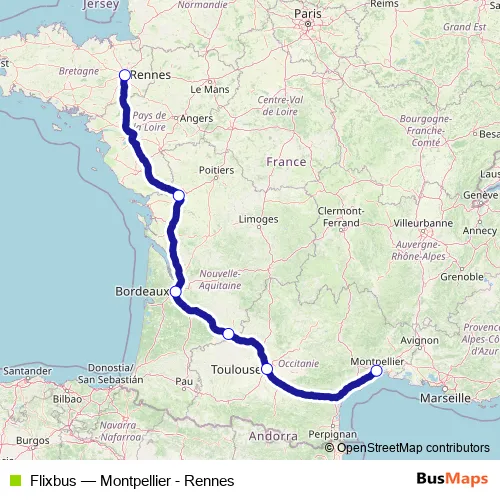 The first stop of the Flixbus bus route is Rennes Bus Station and the last stop is Montpellier Colonel Andre Pavelet dit Villars. Flixbus (Montpellier - Rennes) is operational during todos los días.