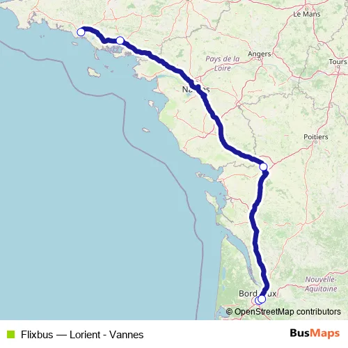 The first stop of the Flixbus bus route is Bordeaux Paludate and the last stop is Lorient Bus Stop. Flixbus (Lorient - Vannes) is operational during todos los días.