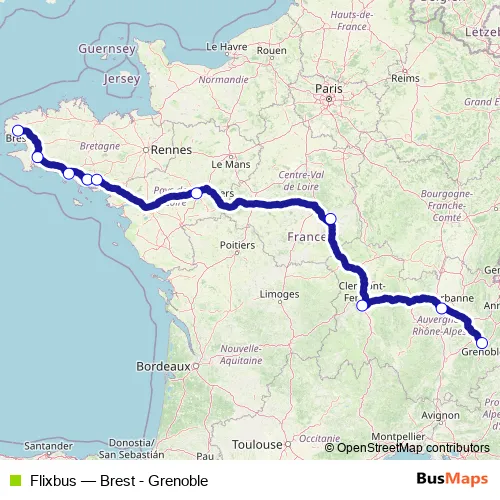 The first stop of the Flixbus bus route is Brest Rond Henri Rol-Tanguy and the last stop is Grenoble Bus Station. Flixbus (Brest - Grenoble) is operational during todos los días.