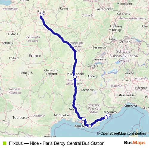 The first stop of the Flixbus bus route is Paris Gare de Bercy Seine and the last stop is Nice Bus Station. Flixbus (Nice - Paris Bercy Central Bus Station) is operational during todos los días.