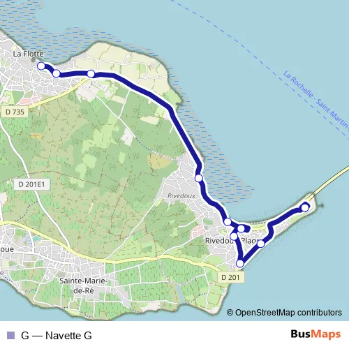 The first stop of the G bus route is La Flotte Le Port and the last stop is