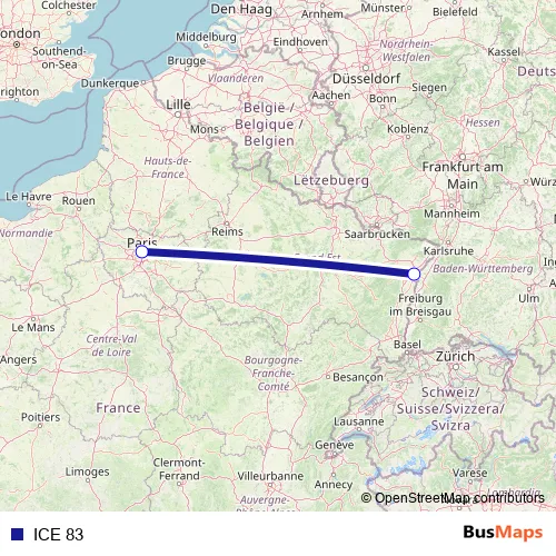 See why over 2 million users trust and consider busmaps.com as the best public transport website. busmaps gives you Strasbourg Rail Services suggested routes, real-time bus tracker, line route maps in Strasbourg, and helps to find the closest ICE 83 rail stops near you. No internet available? Download an offline PDF map and bus schedule for the ICE 83 rail to take on your trip.