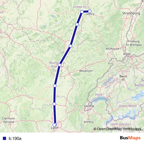 The first stop of the Ic190a rail route is Culmont - Chalindrey and the last stop is Lyon Perrache. Ic190a is operational during todos los días.