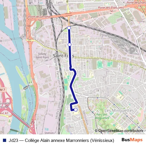 The first stop of the Jd23 bus route is St Fons Dussurgey and the last stop is Collège Alain. Jd23 (Collège Alain annexe Marronniers (Vénissieux)) is operational during entre semana.