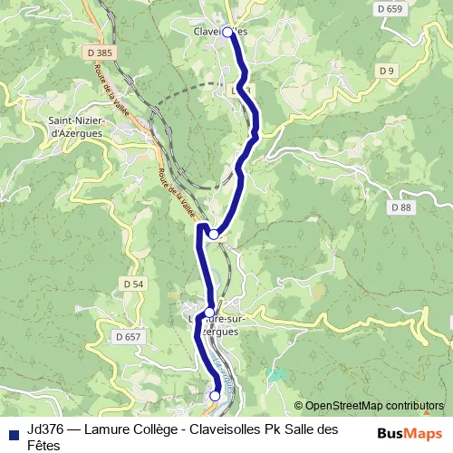 The first stop of the Jd376 bus route is Claveisolles Salle des Fêtes and the last stop is Lamure-Sur-Azergues Collège. Jd376 (Lamure Collège - Claveisolles Pk Salle des Fêtes) is operational during entre semana.