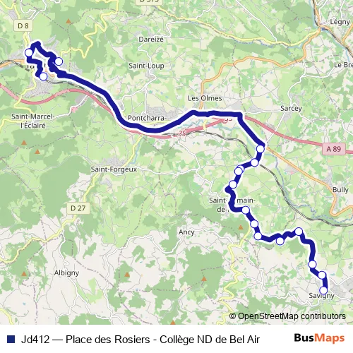 The first stop of the Jd412 bus route is Tarare Lycée ND de Bel Air and the last stop is Savigny Place des Rosiers. Jd412 (Place des Rosiers - Collège ND de Bel Air) is operational during entre semana.
