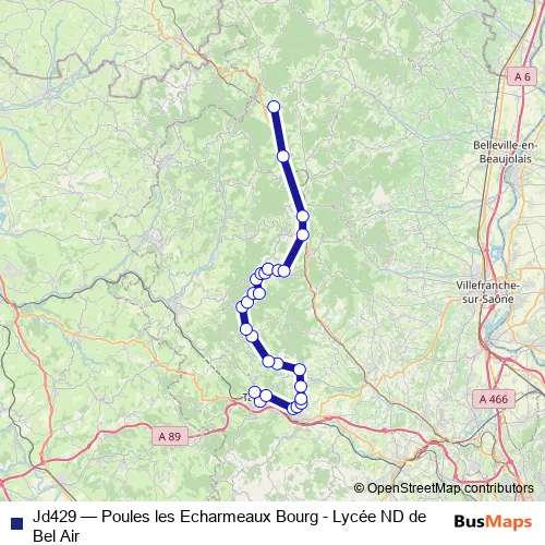 The first stop of the Jd429 bus route is Tarare Lycée ND de Bel Air and the last stop is Poule-Les-Echarmeaux Bourg. Jd429 (Poules les Echarmeaux Bourg - Lycée ND de Bel Air) is operational during todos los días.