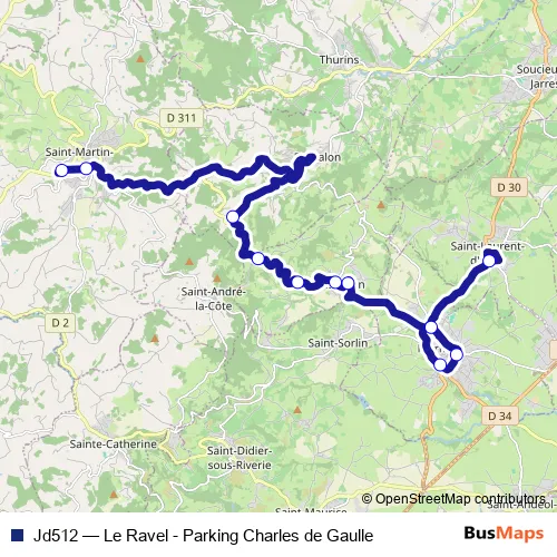 The first stop of the Jd512 bus route is St-Martin - Clg Le Petit Pont and the last stop is St-Laurent d'Agny - Le Ravel. Jd512 (Le Ravel - Parking Charles de Gaulle) is operational during entre semana.