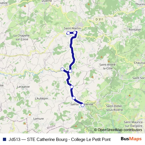 The first stop of the Jd513 bus route is St-Martin - Clg Le Petit Pont and the last stop is Ste-Catherine - Bourg. Jd513 (STE Catherine Bourg - College Le Petit Pont) is operational during entre semana.