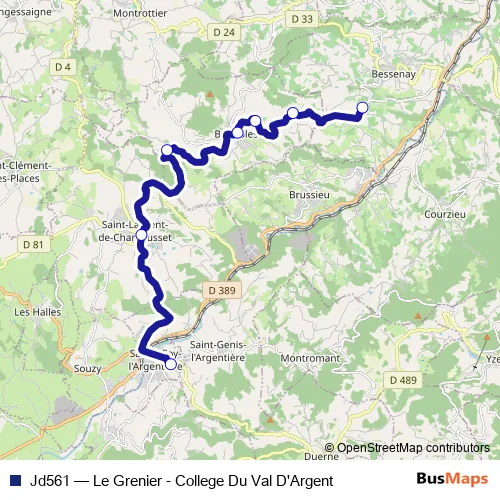 The first stop of the Jd561 bus route is Ste-Foy - Collège Du V. d'Arg. and the last stop is Bessenay - Le Grenier. Jd561 (Le Grenier - College Du Val D'Argent) is operational during entre semana.