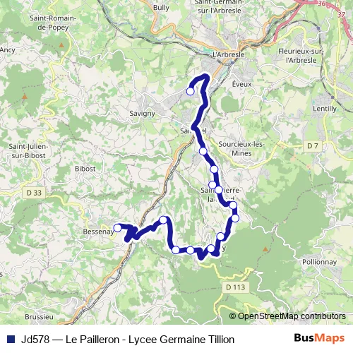 The first stop of the Jd578 bus route is Sain-Bel - Lycee G. Tillion and the last stop is Bessenay - Za Les Garelles. Jd578 (Le Pailleron - Lycee Germaine Tillion) is operational during entre semana.
