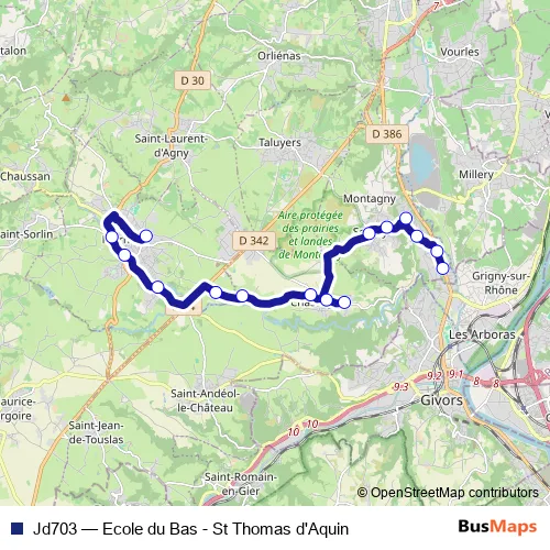 The first stop of the Jd703 bus route is Montagny Ecole du Bas and the last stop is Mornant St Thomas d'Aquin. Jd703 (Ecole du Bas - St Thomas d'Aquin) is operational during entre semana.
