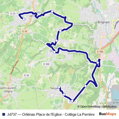 The first stop of the Jd737 bus route is Sou-en-J. Col. La Perriere and the last stop is Taluyers Place. Jd737 (Orliénas Place de l'Eglise - Collège La Perrière) is operational during entre semana.