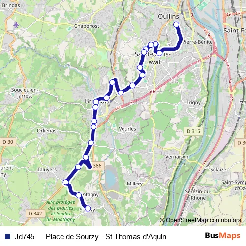 The first stop of the Jd745 bus route is Col. Lycée St-Th.d'Aquin and the last stop is Montagny Place de Sourzy. Jd745 (Place de Sourzy - St Thomas d'Aquin) is operational during entre semana.