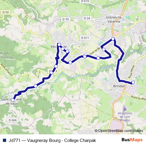The first stop of the Jd771 bus route is Brindas - Collège Charpak and the last stop is Vaugneray - Le Bourg. Jd771 (Vaugneray Bourg - College Charpak) is operational during entre semana.