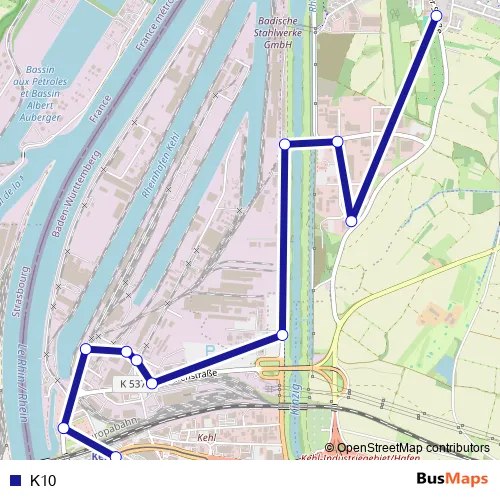 The first stop of the K10 bus route is Kehl Bahnhof and the last stop is Auenheim Süd. K10 is operational during entre semana.