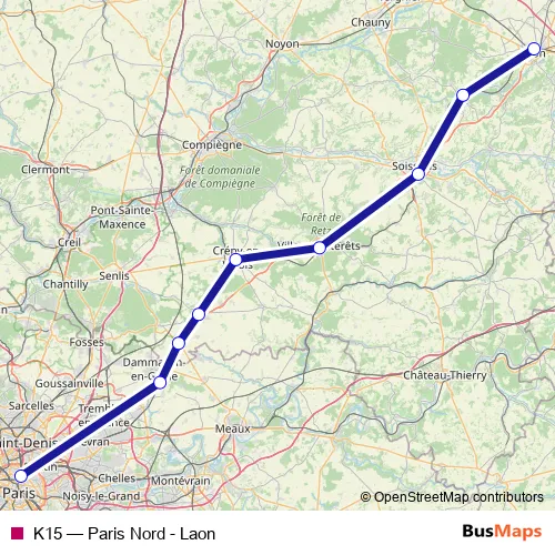 The first stop of the K15 rail route is Paris Gare du Nord and the last stop is Laon. K15 (Paris Nord - Laon) is operational during todos los días.