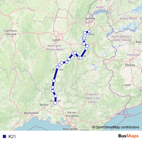The first stop of the K21 rail route is Valence and the last stop is Annecy. K21 is operational during todos los días.
