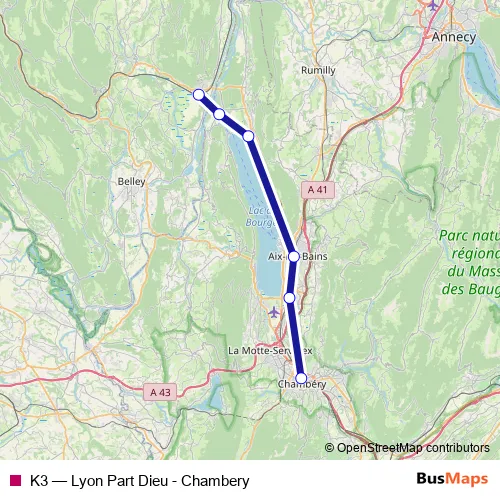 See why over 2 million users trust and consider busmaps.com as the best public transport website. busmaps gives you Chambery Rail Services suggested routes, real-time bus tracker, line route maps in Chambery, and helps to find the closest K3 rail stops near you. No internet available? Download an offline PDF map and bus schedule for the K3 rail to take on your trip.