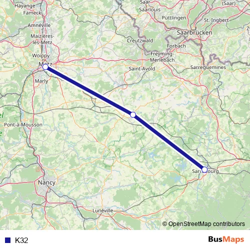 The first stop of the K32 bus route is Sarrebourg and the last stop is Metz Ville. K32 is operational during todos los días.