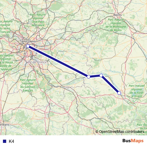 The first stop of the K4 bus route is Paris-Est and the last stop is Troyes. K4 is operational during todos los días.