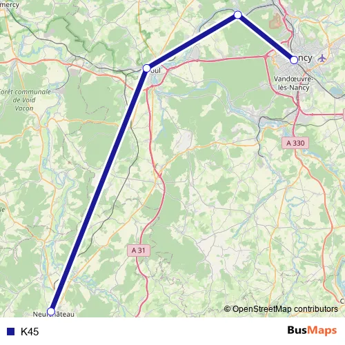 The first stop of the K45 bus route is Nancy and the last stop is Neufchâteau. K45 is operational during los fines de semana.