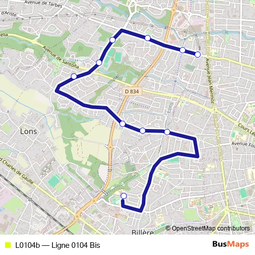 The first stop of the L0104b bus route is Billere College Bois d'Amour and the last stop is Lons Ossau. L0104b (Ligne 0104 Bis) is operational during entre semana.