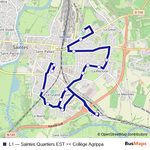See why over 2 million users trust and consider busmaps.com as the best public transport website. busmaps gives you Saintes Buses suggested routes, real-time bus tracker, line route maps in Saintes, and helps to find the closest L1 bus stops near you. No internet available? Download an offline PDF map and bus schedule for the L1 bus to take on your trip.