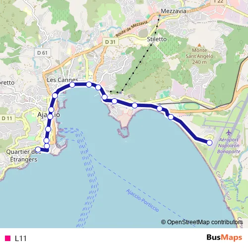 See why over 2 million users trust and consider busmaps.com as the best public transport website. busmaps gives you Ajaccio Buses suggested routes, real-time bus tracker, line route maps in Ajaccio, and helps to find the closest L11 bus stops near you. No internet available? Download an offline PDF map and bus schedule for the L11 bus to take on your trip.