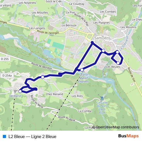 The first stop of the L2 Bleue bus route is Samoens - Grand Massif Express and the last stop is Samoens - Grand Massif Express. L2 Bleue (Ligne 2 Bleue) is operational during todos los días.