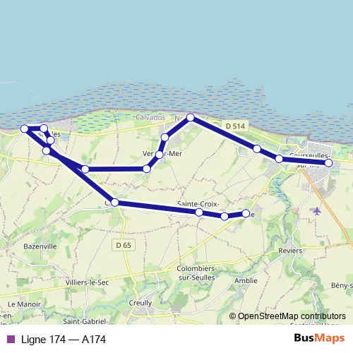 See why over 2 million users trust and consider busmaps.com as the best public transport website. busmaps gives you Asnelles Buses suggested routes, real-time bus tracker, line route maps in Asnelles, and helps to find the closest Ligne 174 bus stops near you. No internet available? Download an offline PDF map and bus schedule for the Ligne 174 bus to take on your trip.