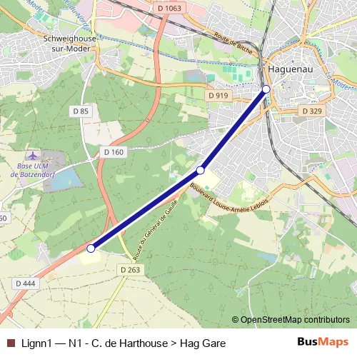 The first stop of the Lignn1 bus route is Centre de Harthouse and the last stop is Gare Sncf de Haguenau. Lignn1 (N1 - C. de Harthouse > Hag Gare) is operational during entre semana.